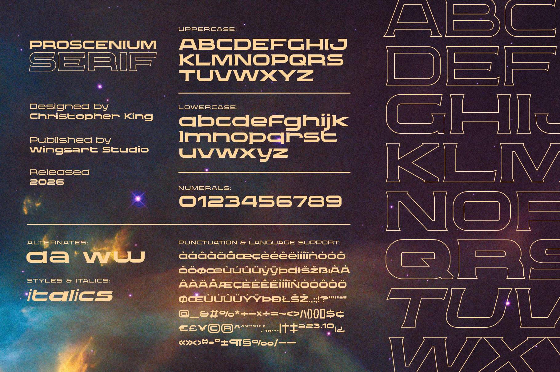 Inspired by the typography of opening titles and credit sequences, the Proscenium series was created to match letterbox style aspect ratios, typical of 35, 65, or 70mm cinema film formats. It boasts a clean, legible style that projects a mature strength, while versatile enough to sit comfortably among contemporary, period or science-fiction genres.